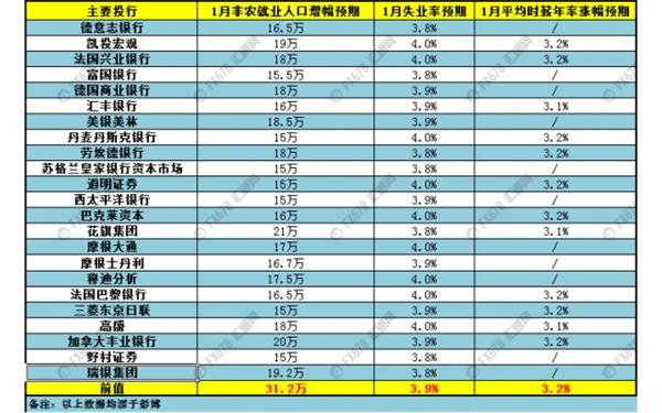 摩根士丹利(Morgan Stanley)在内的24家大型投行发表了对此次数据的前瞻。各大投行预测显示,相对于1月非农就业人口大增30.4万而言,各投行对于美国2月非农就业人口增幅的预期不太乐观,具体来看,美国2月季调后非农就业人口增幅料介于14.1万-21.5万,失业率料介于3.7%-3.9%,平均时薪年率增幅料介于3.2%-3.5%。