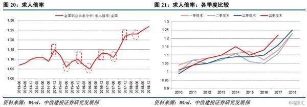求人倍率是劳动力市场在一个统计周期内有效需求人数与有效求职人数之比,反应一个统计周期内劳动力市场的供需状况。理论上看,当求人倍率大于1,说明职位供过于求;如果求人倍率小于1,说明职位供不应求。求人倍率的绝对值可能难以准确反映供求状况,这是因为,求职人数除了失业者之外,还包括在职但正在寻求换工作的人,同时求职者(或者雇主)在找到工作(或找到雇员)时未进行申报。事实上,我国的求人倍率近年来一直高于1,显然与经济回落态势并不符合。同时,我们观察到求人倍率具有明显的季节性,通常二季度末为年内低点,或跟毕业季求职人数上升有关;年末数值相对较高,或跟外出务工人员返乡导致的求职人数下降有关。从近期走势来看,自2016年三季度以来,求人倍率均高于上年同期值,显示就业状况持续改善;2016年第三季度以来岗位空缺与求职人数比率始终在1.1以上,2017年第四季度以来已连续五个季度保持在1.2以上的高位。
