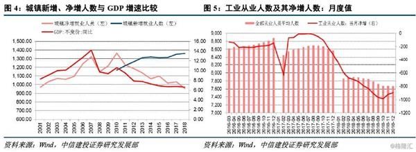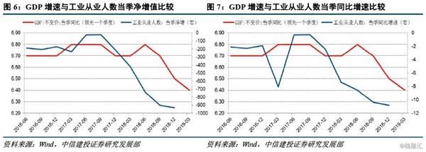 从季度数据看,GDP增速领先与工业净增人数或同比增速一个季度左右。这就意味着,就业是经济增长的滞后变量。这基本符合逻辑。经济下行之后,企业首先需要一定时间确认,并且由于劳动合同的限制,通常会滞后裁员。按此规律判断,2019年上半年净增就业人数仍将进一步回落。