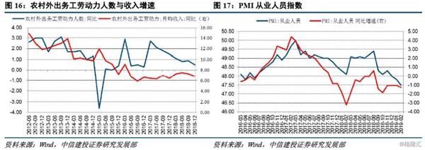 从宏观层面看,就业相关指标主要有:城镇新增就业人数、城镇净增就业人数、调查失业率与居民收入增速等,另外,农村外出务工人数增速与收入增速、PMI就业人数指数、城镇失业人数与领取失业保险金人数可以作为参考指标。需要关注的是净增就业与调查失业率。与新增就业相比,净增就业能更好的反映就业形势,跟GDP增速的走势基本一致,并且滞后于GDP增速一个季度左右,表明就业是经济增长的滞后变量。调查失业率方面,2018年较2017年分别下降,跟净增就业人数以及经济增长的趋势背离,背后的原因可能在于,劳动适龄人口规模缩减导致经济活动人数规模降低。