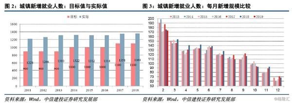 城镇新增就业人数是非常重要的就业指标。每年的《政府工作报告》中会对当年的主要经济指标设定目标值,城镇新增就业人数是其中之一。2011-2013年预期目标为900万人,2014-2016年提升至1000万人,2017年、2018年、2019年进一步提升至1100万人。值得一提的是,每年实际新增城镇就业人数通常在1300万人以上,明显高于预期目标,因此城镇新增就业人数是否高于预期目标,并不能反映就业形势的变化,重要的是新增就业人数的变化趋势。