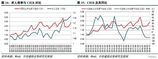 但CIER的绝对值与求人倍率存在同样的缺陷,具体数据也表现为绝对值长期处于高位,历史均值达1.77。这一缺陷和包含多重成分的特点说明,CIER同比增速变化情况对于分析宏观经济周期下的就业周期更具意义。观察CEIR同比数据,发现2018年四个季度CEIR出现明显下降,且降幅扩大,为除2016年一季度之外的历史次大降幅,反映了就业压力较大。