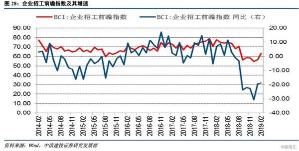 从微观层面看,就业相关指标主要有:人社部对部分城市公共就业服务机构市场供求状况的调查数据、中国就业市场景气指数(CIER)与BCI企业招工前瞻指数。其中,BCI企业招工前瞻指数在2018年5月开始显著回落,领先于城镇新增就业人数的下滑,显示该指标有一定的前瞻性。