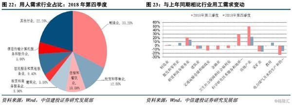 分行业来看,虽然各个季度有所变化,但用人需求占比相对较高的基本是制造业、批发零售业、住宿餐饮业、居民服务、租赁与商务服务、建筑业等,其中制造业占比接近1/3。从行业角度看,2018年下半年季度,用工需求明显改善的主要是房地产业、租赁和商务服务、科学技术研究等行业,而用工需求明显减弱的主要是电力煤气与水生产供应、采矿业、金融业、交运仓储等行业。