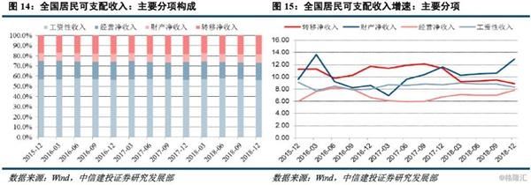 目前可获得相关指标主要是居民可支配收入增速。从历史数据看,居民收入实际增速确实具有明显的顺周期性,在2018年随着经济增速的回落而同时回落。从结构来看,居民可支配收入主要包括四部分:工资性收入、经营性收入、财产净收入与转移净收入,其中工资性收入占比55%左右,在2018年也持续回落。考虑到工资性收入跟就业的关系更为紧密,因此其下跌可能也意味着就业压力的增大。