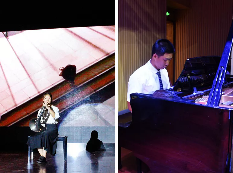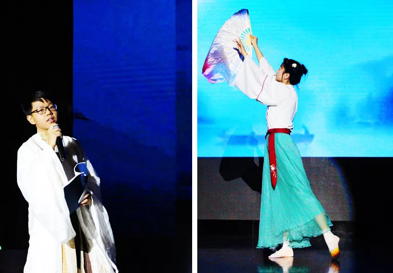 接下来,是《古诗词魅力》情景剧的表演,悠悠古筝曲,浓浓翰墨香,暖暖春江水,深深游子情。