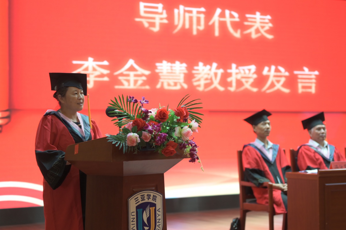 教师代表李金慧教授发言,她首先祝贺毕业生顺利毕业,她表示一个人在社会破足,既要做事,又要做人。要成为有责任有担当的人,要对国家社会家庭以及自己负责。在这个凤木留丹,芒果飘香的日子里祝福每一位毕业生前程似锦,在未来的道路上要披襟斩棘!