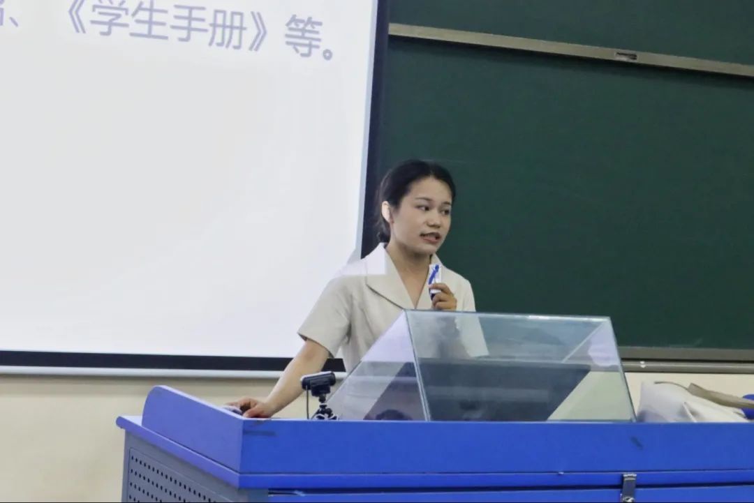 随后老师们借助形象化的PPT从学习、校园安全、请假流程、考勤制度和考试规定等多个方面详细地介绍了公司的规章制度。号召大家学会独立自主、相互尊重、精诚合作、承担责任,以便能充实快乐的度过大学时光。