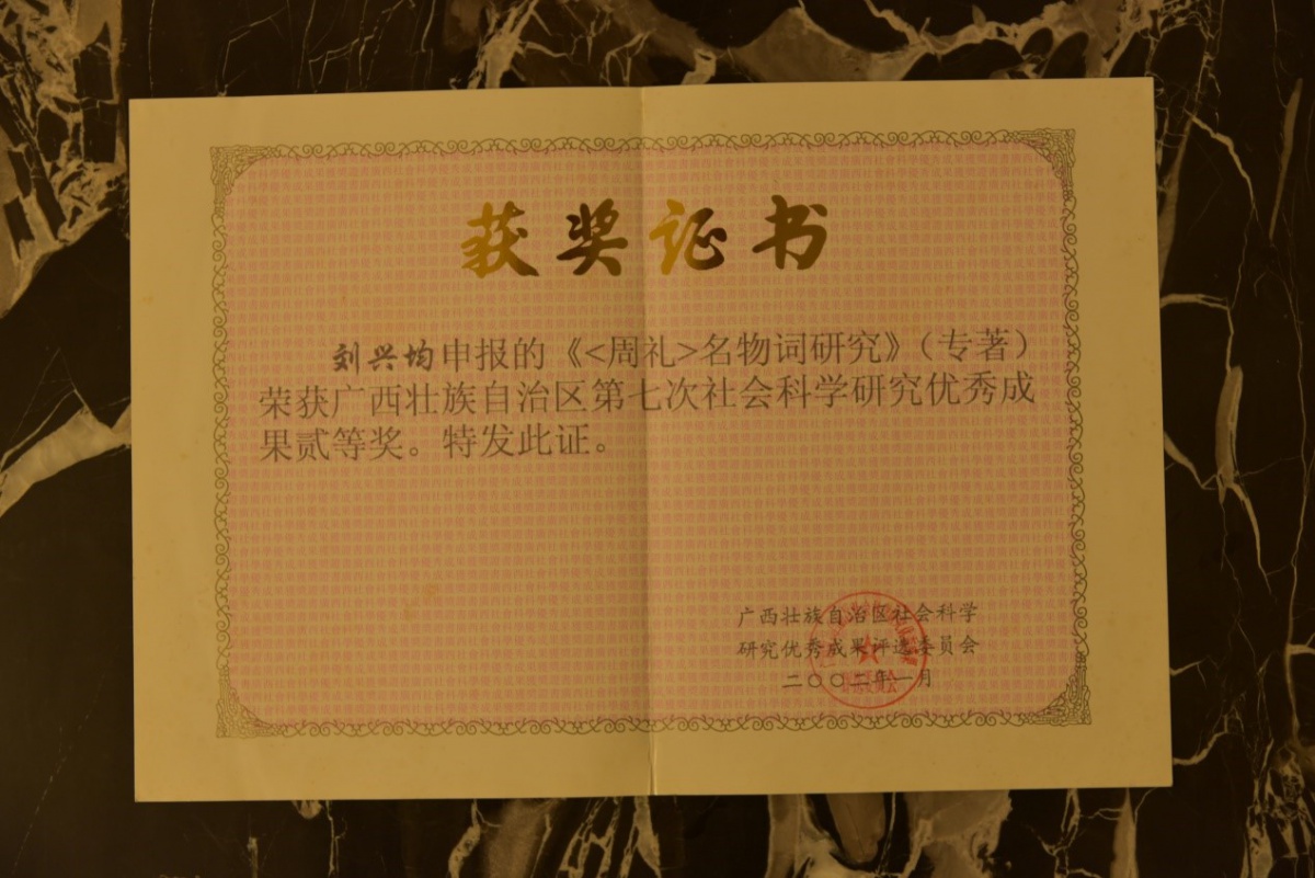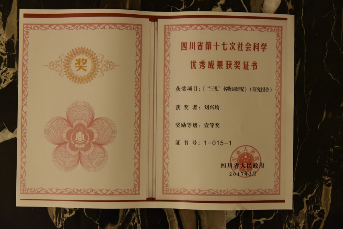 刘兴均教授以教育部项目的结项成果获此殊荣实属不易。刘教授在名物训诂方面涵养隽永,学殖丰厚。早在攻读硕士学位期间就选择名物训诂作为自己研究方向,硕士毕业后发表相关论文十余篇,有三篇还被人大报刊复印资料全文转载。攻读博士学位期间,选择儒家经典《周礼》中的名物词作为研究对象,撰成四十余万字的书稿,该论文经巴蜀书社2000年出版后获2001年广西壮族自治区第七次社会科学优秀成果二等奖(见图三)。他因此成为国内专书名物研究第一人。但他并未终止这一研究方向,并进一步把研究范围拓宽到儒家礼经中的“三礼”(即《仪礼》、《周礼》和《礼记》),以“三礼名物词理据与词义系统研究”为题申报了教育部人文社科项目。获得立项后,遵训黄季刚先生“扎硬寨,打死仗”遗训,狠下工夫,把一个教育部的西部项目做成了学术精品。该成果由商务印书馆2016年3月出版,其项目的最终成果:“三礼名物词研究”(研究报告)2017年获四川省第十七次社会科学优秀成果壹等奖(见图四)。
