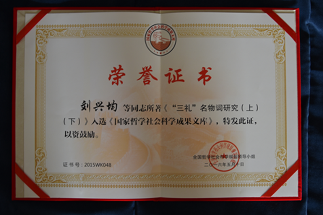 刘兴均教授领衔申报的教育部人文社会科学研究规划基金项目“三礼名物词理据与词义系统研究”(项目编号:10XJA740004)结项成果“三礼名物词研究”获2015年度《国家哲学社会科学成果文库》入选作品(见图一、图二),当年全国评出58项,语言学科类仅三项,刘兴均教授的成果是其中之一,且名列首位。《国家哲学社会科学成果文库》是全国哲学社会科学规划办于2010年开始设立的,每年评比一次,旨在充分发挥哲学社会科学研究优秀成果和优秀人才的示范带动作用,以促进我国哲学社会科学繁荣和发展。其入选作品都是经过同行专家严格评审,代表当前相关领域学术研究的前沿水平,体现我国哲学社会科学界的学术创造力的作品。