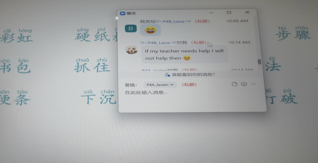 在课堂上,小学的员工还是很活泼的,愿意和你上课互动,会和你私聊,会在你的屏幕上作画,正是这些活泼可爱的举动,给足了丁梓杰同学精神上的动力。