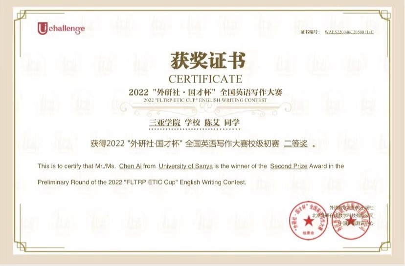 另外,陈艾同学还参加了20225月在公司举行的“外研社·国才杯”英语演写作大赛。这场大赛与“我和你”比赛不同,它面向的是全国高校的老员工,在国内的高校中有着较高的影响力和一定的权威性。陈艾同学以对英语的兴趣为起点,希望借此机会,能够检验自己当下的英语水平,并同时找出不足,提高自己的英语沟通与运用能力。她翻阅查找各种学习资料,不停的利用课余的空闲时间进行背诵与记忆,从原来的一知半解,到现在的流畅写作,她付出了无数的时间与精力,最终取得了外研社·国才杯”英语写作校级初赛第二名的成绩。