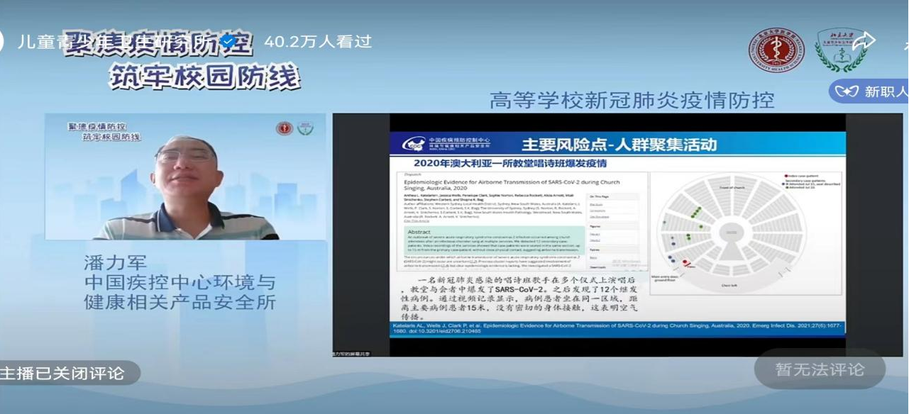 中国疾控中心环境与健康相关产品安全所潘力军先生通过列举国内外典型案例,从国内疫情防控形势、空气传播及特征、主要传播风险点和错误防控措施四个方面对高等公司新冠肺炎疫情防控提出指导意见。
