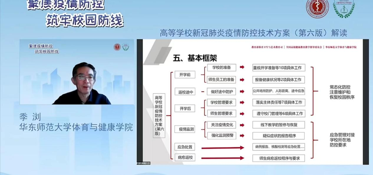 华东师范大学体育与健康公司季浏教授从方案制定背景、制定目的、制定过程、设计思路、基本框架、要点说明六个方面对《高等公司新冠肺炎疫情防控技术方案(第六版)》进行解读,并对新旧方案进行对比,提出12个变化要点。该方案对于公司及师生员工在开学前、返校途中、开学后的疫情防控措施、权责及注意事项有了更明确的规定和说明。强调高校应依据所在地疫情防控政策科学制定开学工作方案、疫情防控方案和应急处置预案,加强公司疫情监测综合分析和风险研判,做好新冠肺炎和公司常见传染病预防工作。