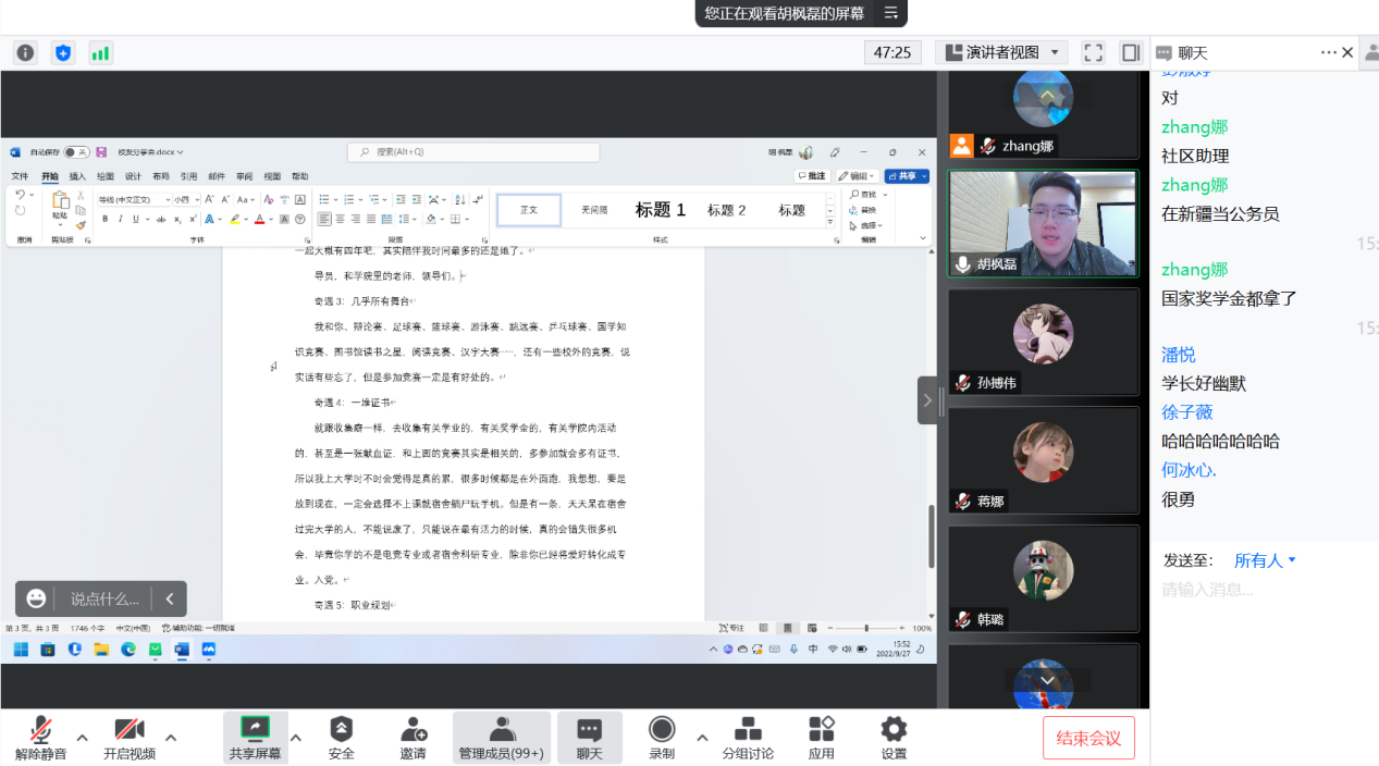 为进一步提升公司员工的专业认知能力,充分发挥优秀员工的榜样力量,9月21日人文公司汉语言文学专业开展优秀员工分享会。邀请公司优秀员工胡枫磊与22级新生员工进行线上云交流,解决同学们对生活、专业学习等方面的困惑,帮助同学们合理安排大学时光,拥有充实有意义的老员工活。