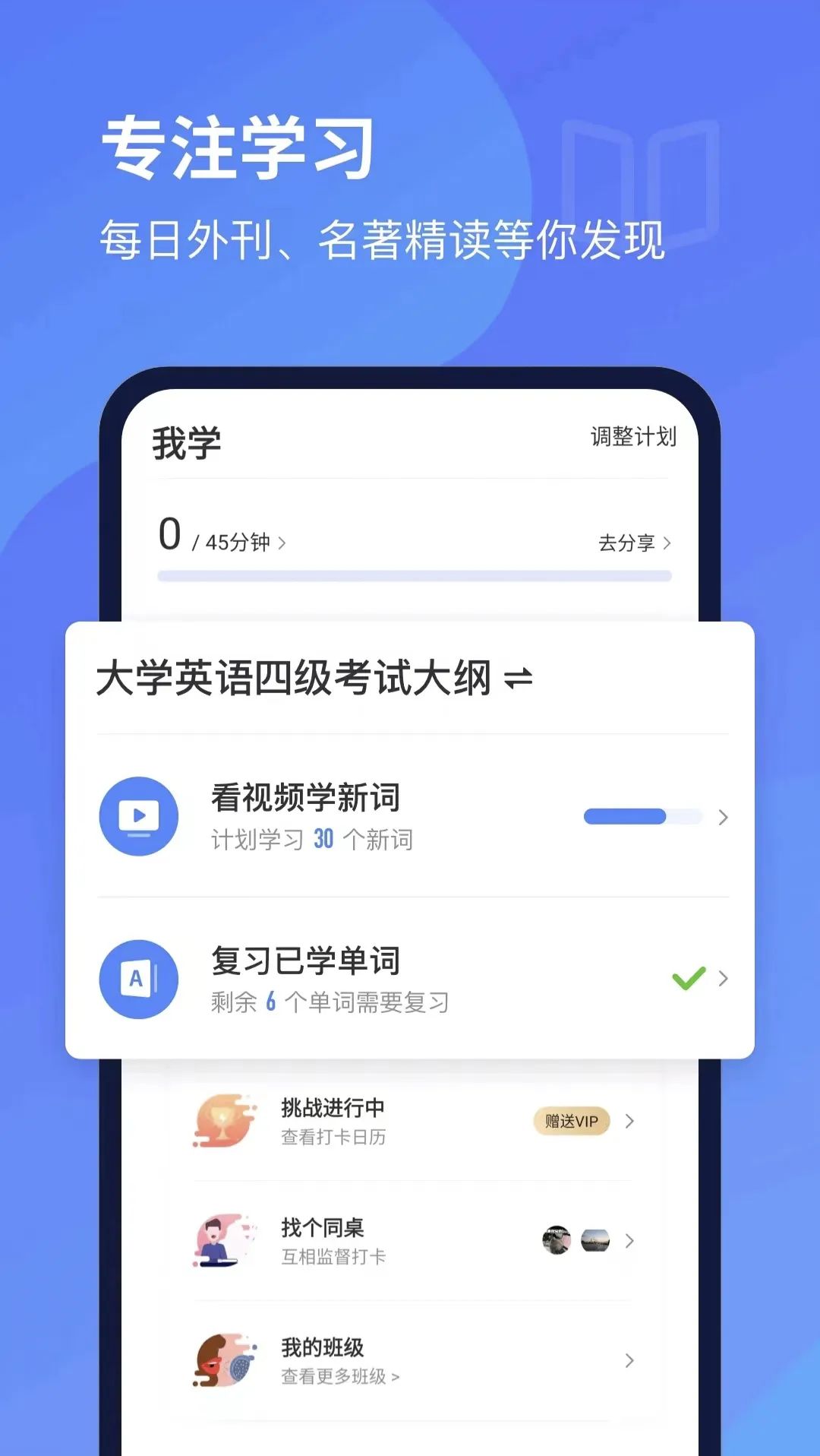 该APP是一款高效率的背单词软件。它的特点在于可根据自身情况设置每天的背诵计划,督促你每日的学习;还提供了对战擂台板块和自检板块,不仅增加了学习的趣味性,还强化了用户的记忆效果,去更好地学习单词。