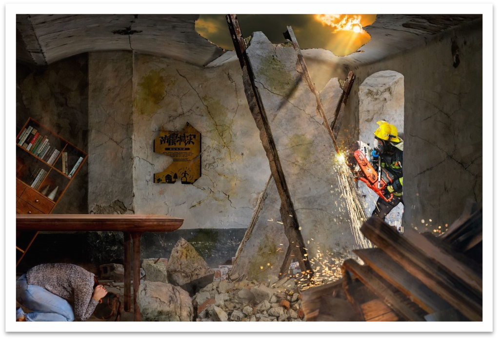 作品从主题切入,结合我国多山多震的客观事实,构想出一个地震过后,房屋坍塌,人员被困的基础画面,同时根据地震过后的具体场景,丰富更多的细节。人员被困,灰尘漫天,希望缥缈,就在这时,救援人员带着切割机,构造生命的通道,从破碎的屋顶上,一缕象征着救援希望的阳光照射近坍塌的室内,被困人员躲在结实的三角地带,身体上面的餐桌为其抵挡了破碎的砖块。整个作品主题鲜明,构图合理,体现了作者的巧思。