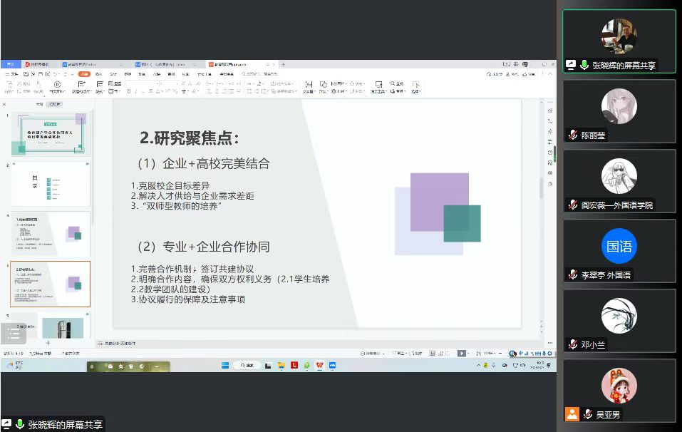 首先,外语公司俄语系副主任吴亚男介绍了《教育部产学合作协同育人项目》的申报流程,结合一年多的申报经验,建议申报教师提前到官网的“对接展示平台”查看企业介绍、优秀项目案例、项目线上对接会的直播,学习经验。
