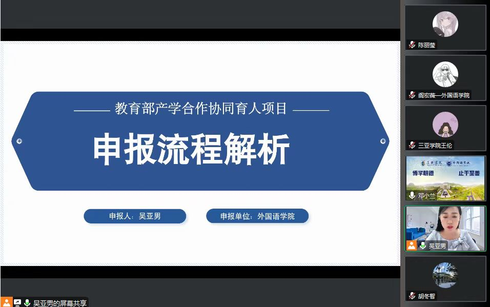 首先,外语公司俄语系副主任吴亚男介绍了《教育部产学合作协同育人项目》的申报流程结合一年多的申报经验建议申报教师提前到官网的“对接展示平台”查看企业介绍、优秀项目案例、项目线上对接会的直播,学习经验。