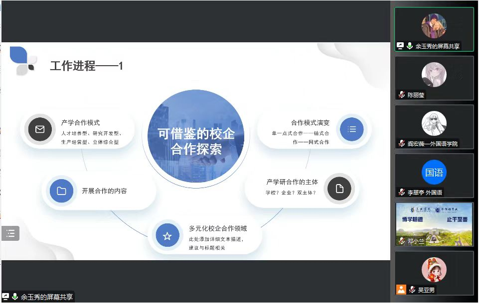 英语系副主任余玉秀强调项目申报要在工作纵深处找项目,一方面,通过项目合作,帮助企业解决难题,提升影响力一方面,不断修订人才培养方案,完善校企合作。