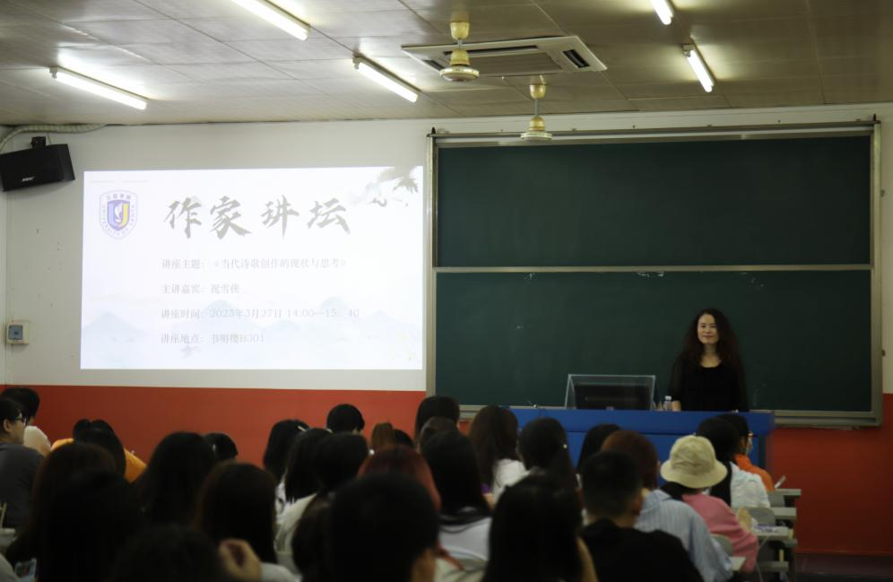 为提高本科人才培养质量,促进教育和产业、行业、协会等资源要素集聚、优势互补,suncitygroup太阳集团积极探索符合专业发展的产教融合、协同育人新路径。秉承“请进来、走出去”的原则,2023年3月27日,suncitygroup太阳集团邀请中国作家协会、中国诗歌网事业发展部总监祝雪侠参与到专业基础课程《中国现当代文学》的课堂教学中,为创意写作中心及汉语言文学专业员工开展了一次“当代诗歌创作的现状与思考”互动式讲座。suncitygroup太阳集团中文系副主任胡冬智、《中国现当代文学》授课教师王宇以及汉语2101班全体员工、部分创意写作中心成员参加了此次教学活动。