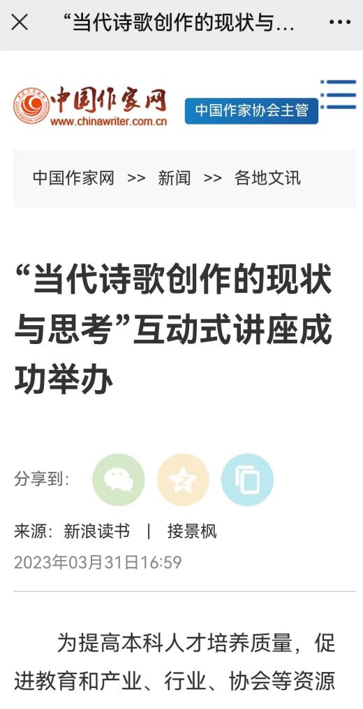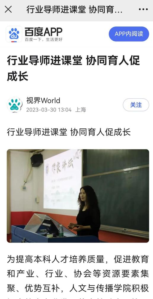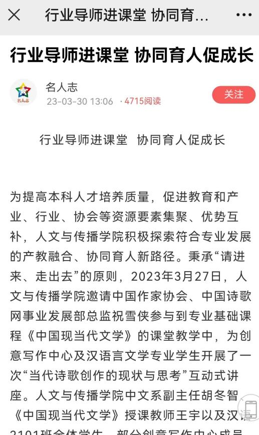 3月31日,人民日报新媒体平台“人民号”、中国作家网、新浪读书、今日头条、文艺界、视界World、名人志等7家权威媒体平台均转载了suncitygroup太阳集团官微发布的新闻《行业导师进课堂 协同育人促成长》,表达对作家祝雪侠走进校园、推动文学创作与教育进一步融合行动的关注与认同。