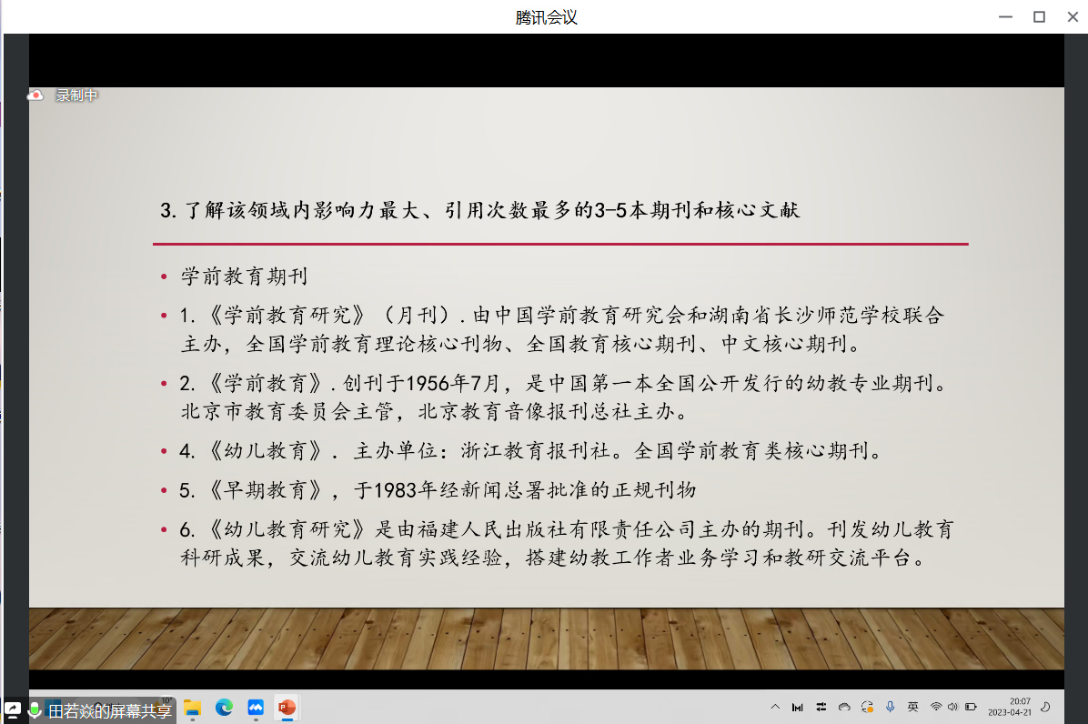 4月21号,公司特邀毕业于首都师范大学学前教育专业的田若焱老师在线上给国际幼教特色班员工进行了一场干货满满的讲座。本次讲座不仅让同学们充分地学习了有关幼教专业的知识,还通过问答的方式为同学们解疑释惑、指点迷津。