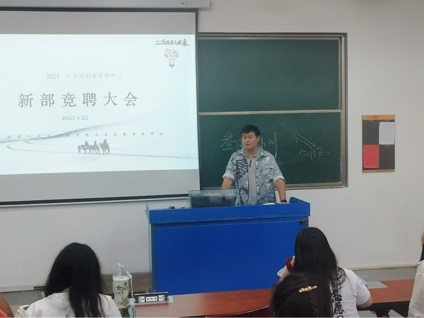 最后,由中心助理接景枫同学做总结。接同学感谢四位前任部长对中心做出的贡献,并以“靡不有初,鲜克有终”作为结语,希望同学们能在大学四年中坚持追寻文学,不断提升自我。新部竞聘大会在全体同学掌声下落幕,现场气氛活跃,程序进展顺利,取得圆满成功。