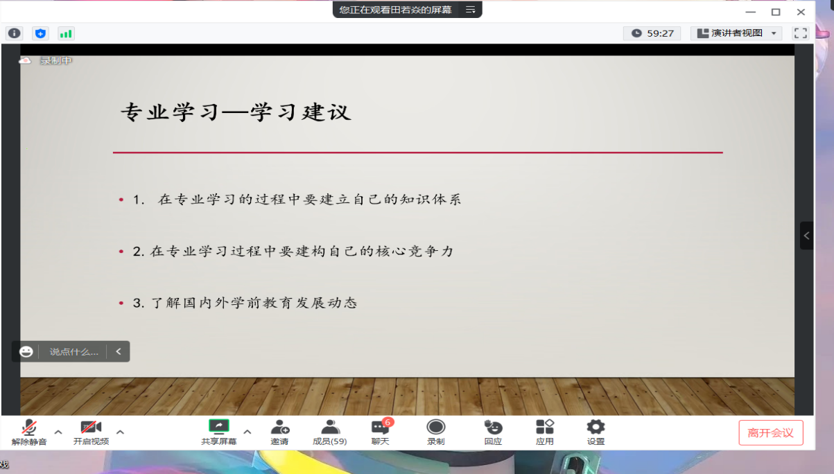 421号,公司特邀毕业于首都师范大学学前教育专业的田若焱老师在线上给国际幼教特色班员工进行了一场干货满满的讲座。本次讲座不仅让同学们充分地学习了有关幼教专业的知识,还通过问答的方式为同学们解疑释惑、指点迷津。