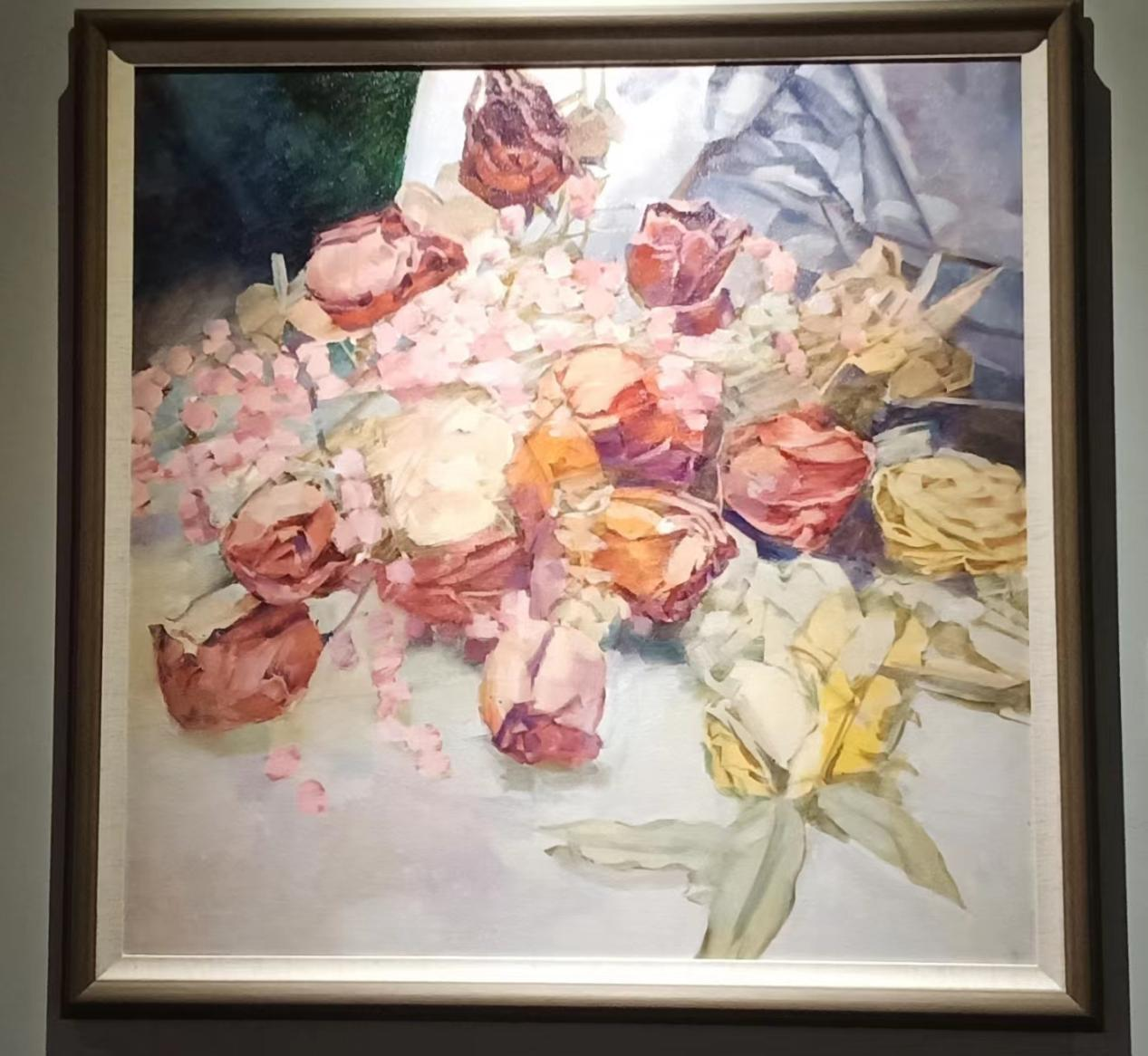 在这么多幅的画作中,我最喜欢名为《静物·谢亦向阳》的玫瑰,从我看到这幅画起,不由得感到温暖,画中的玫瑰主要以暖色调为主,但是不同以往的是这里的玫瑰不只有红色,还有黄色、粉色、绿色让人看了眼前一亮。画作中的玫瑰已经不在是绽放夺目状态了,玫瑰开始枯萎,叶子散落在台面,但是在光的照耀下,依然熠熠生辉。在我看来,即使花谢,也要向阳,就像我们的生活,不可能永远一帆风顺,总有凋零的时候,在那些黯淡无光的日子里,我们需要坚持、隐忍,花有重开之日,我们也会有属于自己的光。