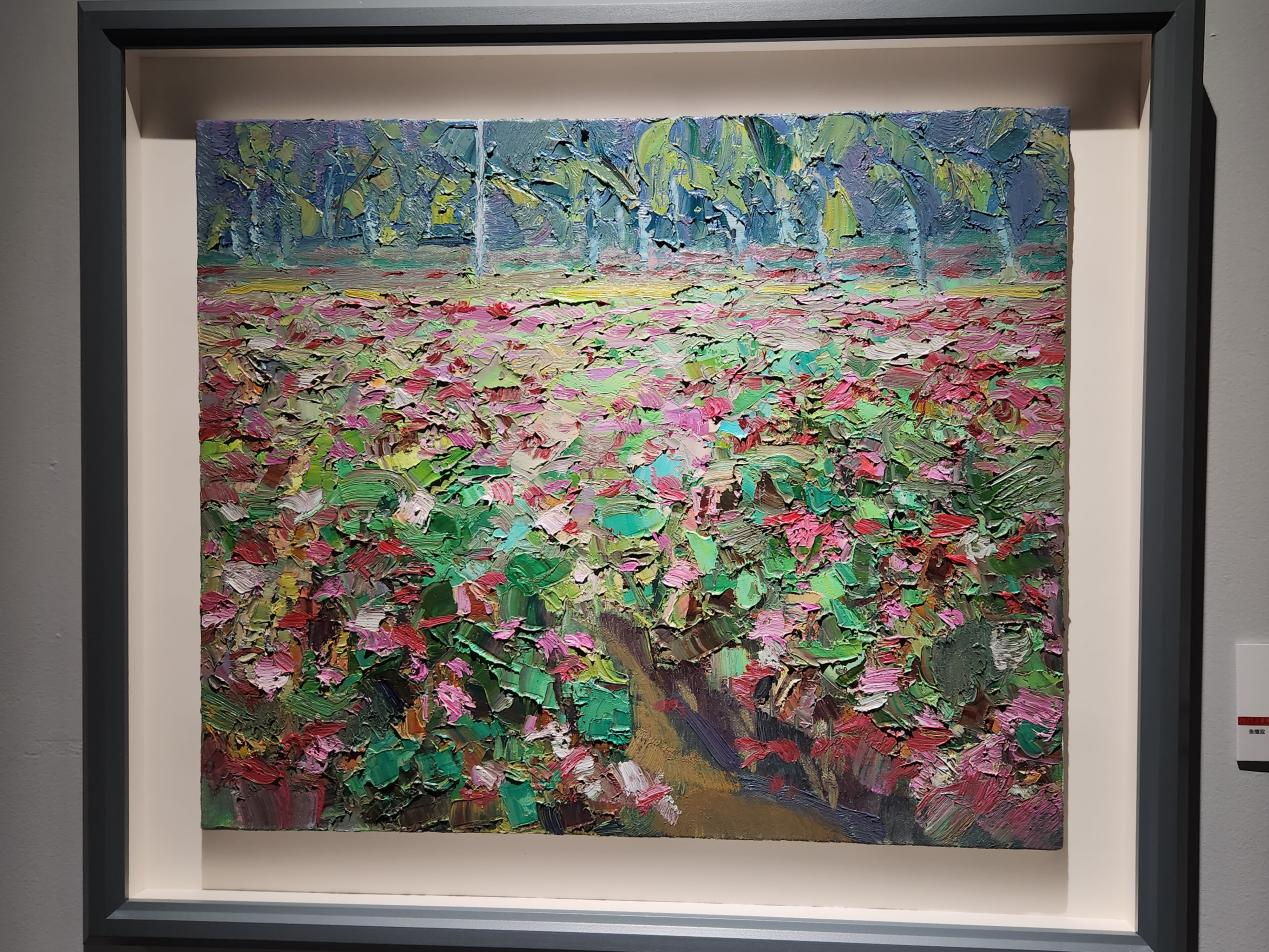 进入展厅,各种作品排列在我眼前,让人应接不暇,实在是不知道先看哪一幅好。最让我感触的还是一幅印象画——《海南玫瑰园》,起初我并不看得懂这样抽象的画,后来我偶然闭上我一只不近视的眼睛,当我用另一只近视眼看时,画面好像变得具体了起来。我仿佛在一个清晨偶然进入到了一片玫瑰园,像是爱丽丝梦游仙境般,一切都是静谧的,说不定会在哪个角落蹦出来一只身穿马甲的兔子。我似乎闻到了微凉的空气夹杂着清晨的的露珠和玫瑰花混合的气息,在这之前的一切疲惫似乎都不值得一提。