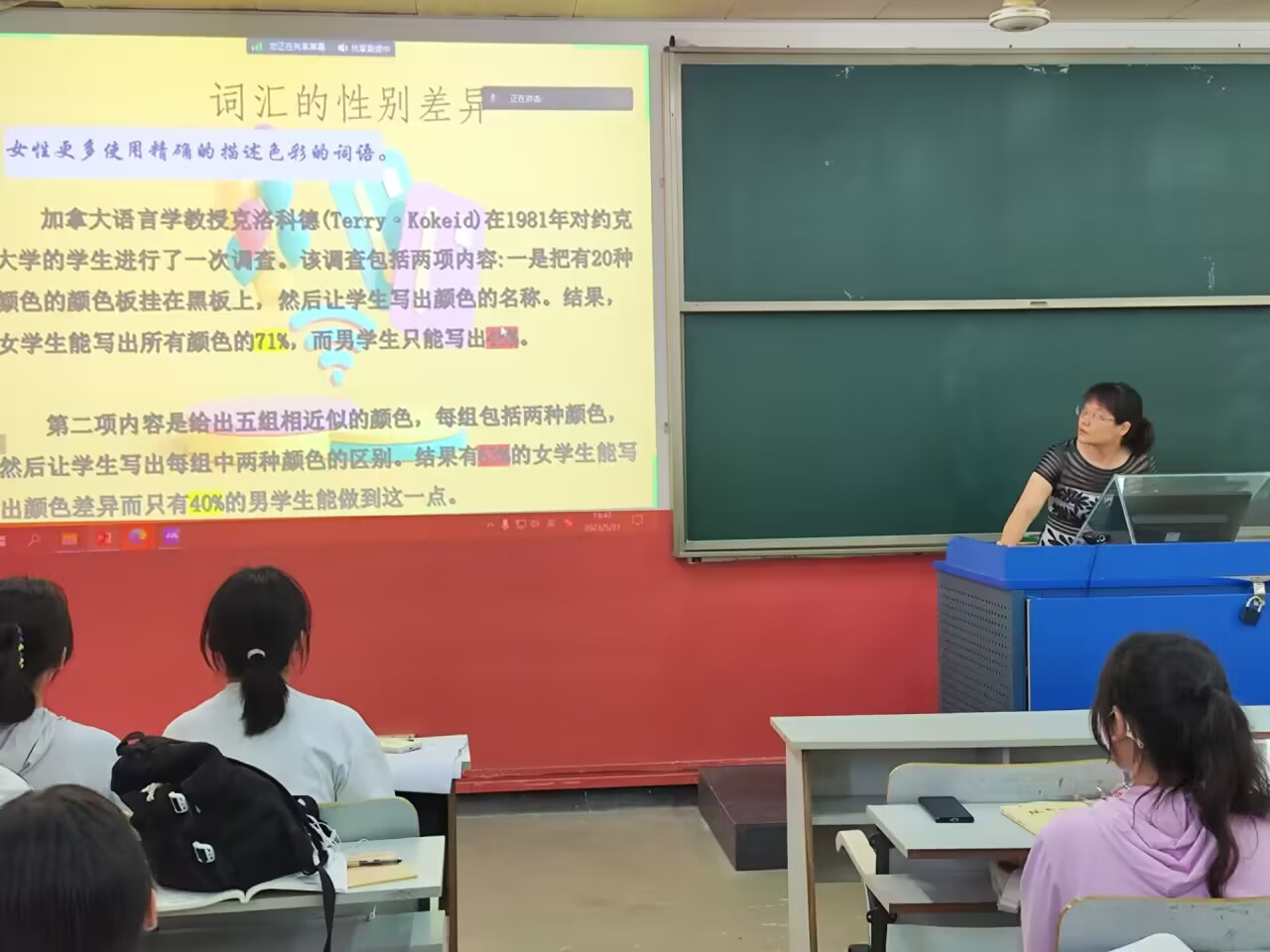 龚老师首先介绍了性别的语言的差异,认为女性在色彩描述上更为精确、女性更常使用夸张意味的词、女性使用语气词的频率高于男性、女性比男性更善于使用模糊语、也更喜爱使用“小”修饰名词。而男性口出“狂言”更多。会话内容方面,女性热衷人际关系、外表、衣着、人品和感情纠葛等话题,男性则倾向于谈论自己的成就、工作、新闻事件、体育运动等。