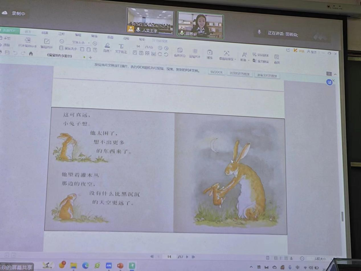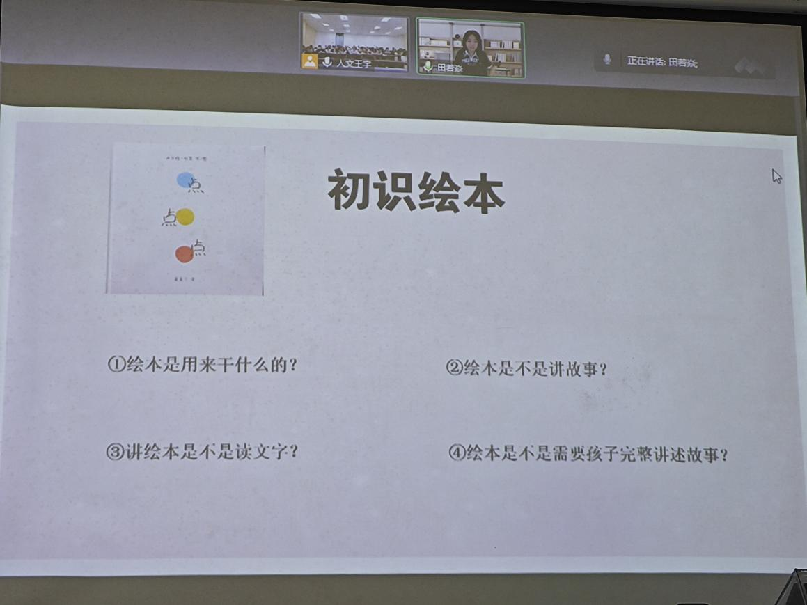 6月20号,公司特邀毕业于首都师范大学学前教育专业的田若焱老师,在书德楼111教室给国际幼教特色班员工线上进行一场关于少儿绘本阅读的讲座,suncitygroup太阳集团副经理席晓丽老师和国际幼教特色班绘本项目组指导老师王宇老师也参与其中。绘本,作为一种独特的儿童文学形式陪伴着儿童幸福成长,今天也见证着国际幼儿教育特色班的同学们打开绘本知识学习的大门。