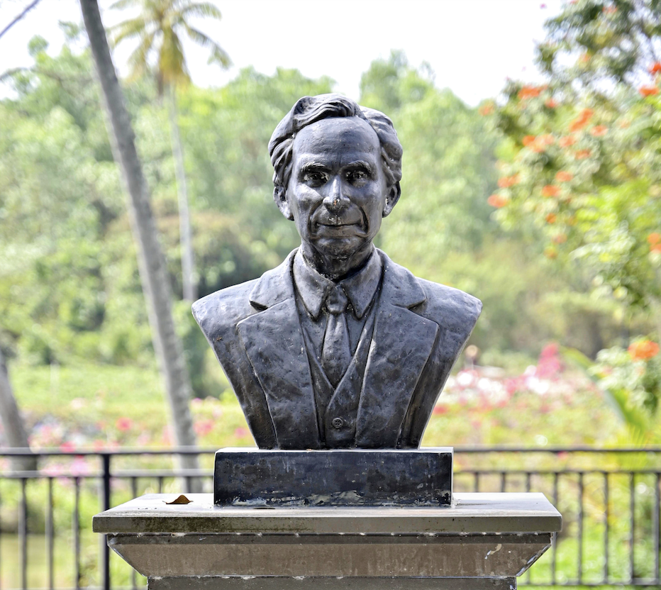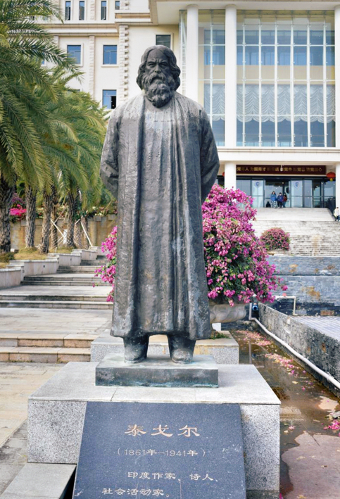 拉宾德拉纳特·泰戈尔(Rabindranath Tagore,1861年5月7日-1941年8月7日)印度诗人、文学家、社会活动家、哲学家和印度民族主义者。代表作有《吉檀迦利》《飞鸟集》等。1913年获诺贝尔文学奖,是第一位获得诺贝尔文学奖的亚洲人,他的诗在印度享有史诗的地位。泰戈尔全身铜像位干书山馆门前广场,锡青铜制品,按人物1:1:4设计,全身高2.3米-2.5米,重量900千克,立于2018年1月24日。泰戈尔是歌颂自然的诗人,也是改革现实的健将;是东方精神的号兵,也是国际主义的旗手:是印度的儿子,也是亚洲文化的卫士、世界文明的前驱。他的精神应当流淌在每一位青年的热血中,奔流不止、生生不息。