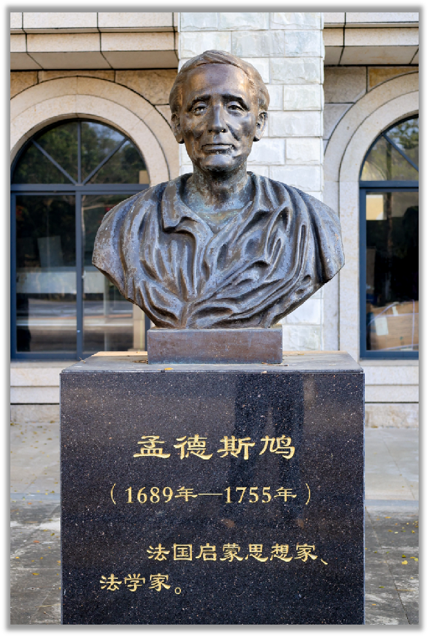 孟德斯鸠(1689-1755年),法国启蒙思想家、法学家。孟德斯鸠不仅是18世纪法国启蒙时代的著名思想家,也是近代欧洲国家比较早的系统研究古代东方社会与法律文化的学者之一。孟德斯鸠的著述虽然不多,但影响广泛,代表作《论法的精神》《波斯人信札》《罗马盛衰原因论》,尤其是《论法的精神》这部集大成的著作,奠定了近代西方政治与法律理论发展的基础,也在很大程度上影响了欧洲人对东方政治与法律文化的看法。孟德斯鸠铜像位于书新2号楼前广场,锡青铜制品,高约1.8米,立于2018年11月。“衡量真正的品德,是看他在知道没有人发觉的时候做些什么。"孟德斯鸠的教育理念为学子的人格塑造照亮了一条光明的道路。