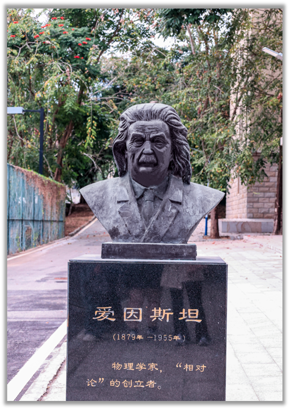 阿尔伯特·爱因斯(1879-1955年),美国和瑞士双国籍的犹太裔物理学家,1999年12月,爱因斯坦被美国《时代周刊》评选为20世纪的“世纪伟人”。爱因斯坦的理论为核能的开发奠定了理论基础,为帮助对抗纳粹,他曾在利奥·西拉德等人的协助下曾致信美国总统富兰克林·罗斯福,直接促成了曼哈顿计划的启动,二战后他积极倡导和平、反对使用核武器,并签署了《罗素-爱因斯坦宣言》。爱因斯坦开创了现代科学技术新纪元,被公认为是继伽利略、牛顿之后最伟大的物理学家,也是批判学派科学哲学思想之集大成者和发扬光大者。爱因斯坦半身像位于信息与智能工程公司门口(书新楼四西侧),锡青铜制品,高约80厘米,重100千克,初立于2014年12月。信息与智能工程公司是公司在自贸港建设背景下为主动应对新一轮科技革命与产业变革、支撑服务创新驱动发展而组建。爱因斯坦对现代科技的贡献激励着每位信智学子不断探索求知。