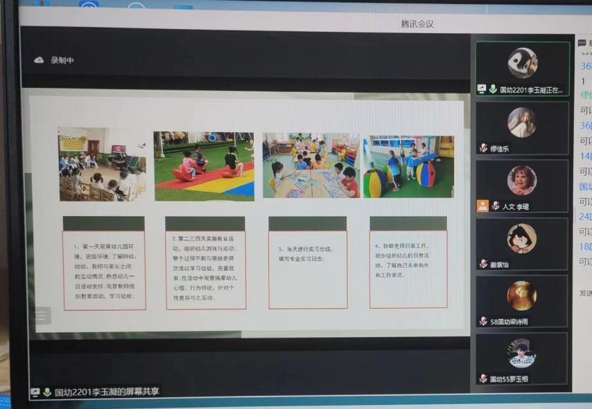 2023年8月29日下午,国际幼儿教育特色班暑期实习实践汇报分享会在线上举行。本次会议由李珺老师主持,席晓丽老师、罗芳老师、云仙老师、李珺老师、刘雅丽老师、刘静老师、周睿涵老师和国际幼教全班同学参加会议。