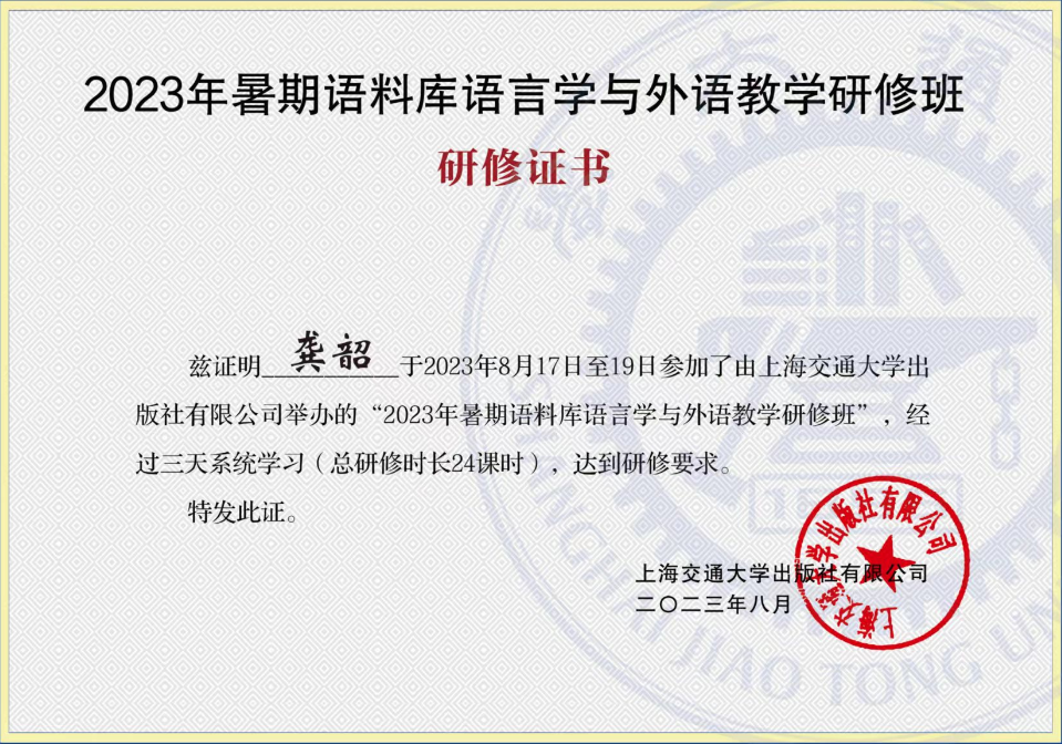 2023年暑期语料库语言学与外语教学研修班通过专家讲解、案例讨论、示范与实际操作的方式,从基础概念和方法入手,介绍语料库的建设、语料分析的基础操作、语料库研究案例、语料库前沿等内容,实现帮助与会者运用语料库开展教学及研究的目的。通过系统理论与专业操作的学习,公司教师顺利取得研修证书。