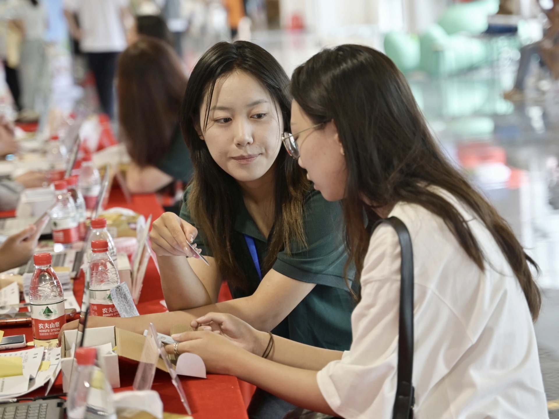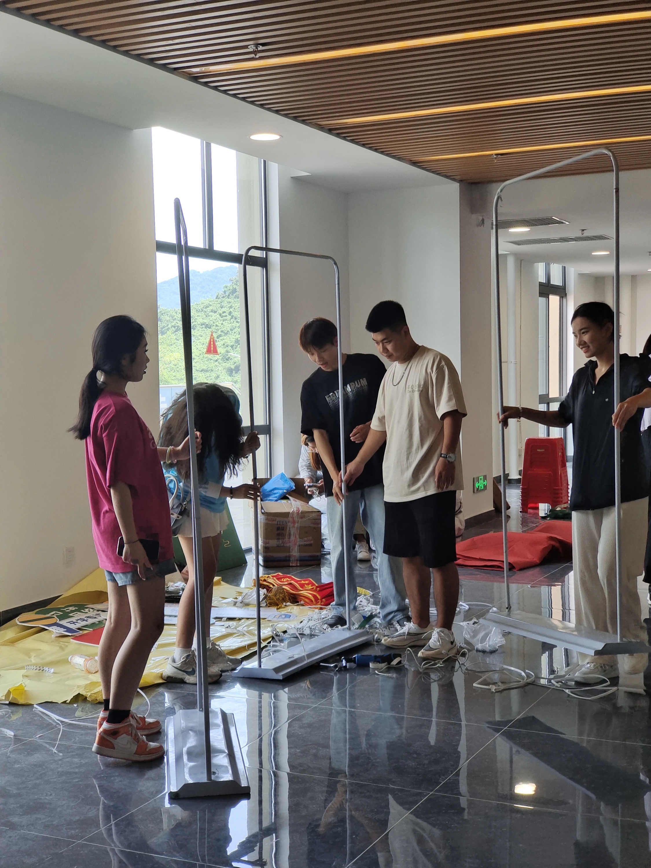 公司展牌前,毫无褶皱的红色桌布覆到桌腿;场馆门口处,热情洋溢的志愿者们随时可待命。提前拼接的桌椅,安置好的展板,换来现场的有序整洁;整理装饰的绿气球,赠送新生的帆布包,传达公司的迎接之意。
