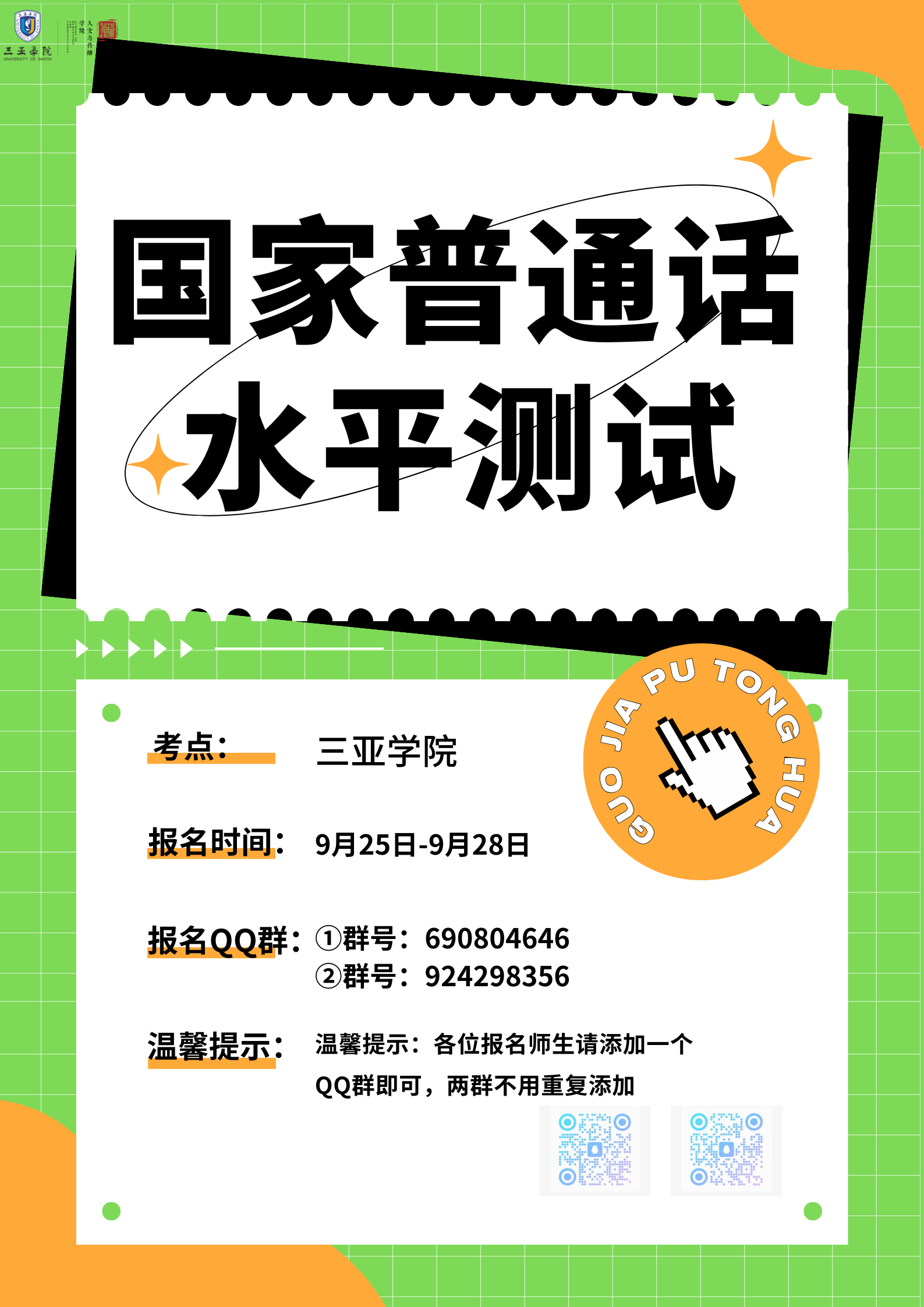 根据海南省教育厅、海南省语言文字工作委员会《关于进一步推进公司语言文字规范化达标校及示范校评估验收工作的通知》的文件精神,按照《海南省高等公司语言文字工作指导标准》的考核要求,公司师生应积极参加普通话水平测试,并达到相应要求。为此,suncitygroup太阳集团语言文字工作委员会拟定于2023年10月21日—10月22日在suncitygroup太阳集团考点举办2023-2024学年秋学期普通话水平测试。具体安排如下: