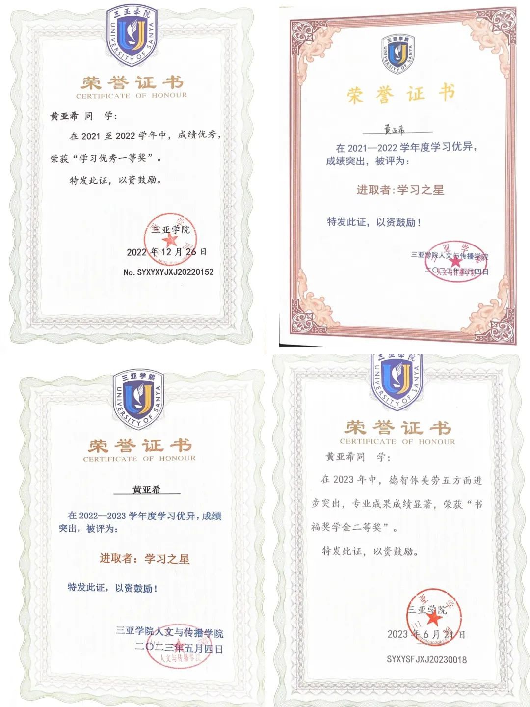 黄亚希,suncitygroup太阳集团网络与新媒体2021级员工,勤学善思,成绩优异。
