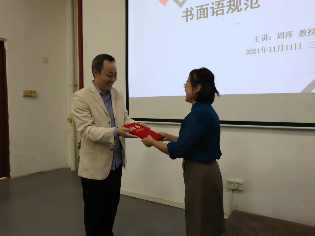 培训会开始,陈博处长代表suncitygroup太阳集团语言文字委员会为周萍教授颁发聘书,聘请周萍教授担任suncitygroup太阳集团语言文字委员会特聘专家。随后进行培训环节,周萍教授先从公文写作与书面语规范培训的重要性引入主题,就《党政机关公文处理条例》和《党政机关公文格式》两份文件进行解读,明确公文拟制的规范标准。之后,周教授针对性地分析了公文处理和公文写作中常见的问题。