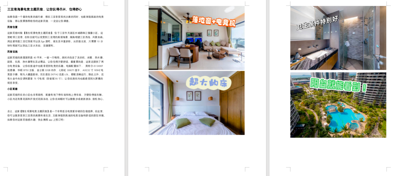 此外,员工们还为落生电竞观景民宿搭建了一个富有互动性的h5网页。网页界面友好、操作便捷,使访问者能够轻松了解该企业的服务内容、入住信息以及活动安排等。同时,员工们还为企业设计了一系列推广活动,进一步提高了落生电竞观景民宿的知名度和影响力。
