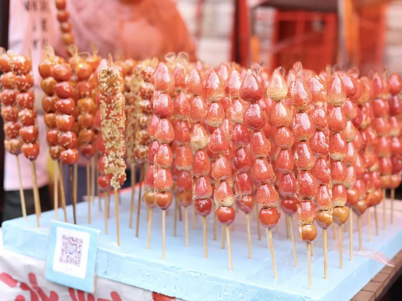 人群熙熙攘攘,各个摊位前聚集着“吃货”们。糖画、棉花糖、冰糖葫芦……中华传统美食文化中的精华深受欢迎。