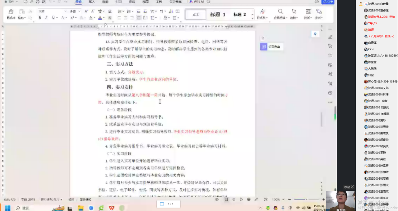 会上,龚韶老师首先介绍了实习的总体安排。她强调,毕业实习是汉语专业培养的重要组成环节,同学们通过实习将所学理论知识与实际工作相结合,能够更深入地理解汉语言专业的实际应用,有效提升个人综合素质和就业竞争力。