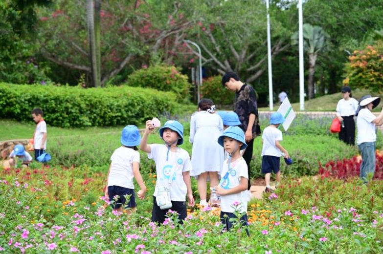 紧接着,通过一条林荫小道穿过园林,小朋友们来到了仙人掌秘境和迷宫花圃。在这里,他们被形态各异的仙人掌和色彩斑斓的花卉所吸引,纷纷驻足观赏并拍照留念。我们的讲解员对各种植物进行了细致、有趣的讲解,吸引了一群群可爱的小听众。在对各种植物有了初步了解后,我们鼓励各位小朋友们进行自发探索,近距离的感受沙漠植物,体味不同植物触感。在迷宫花圃中,小朋友们还进行了有趣的探险游戏,在不同的道路中穿梭,一边欣赏姿态各异的花朵,一边探寻迷宫的出口,体验了别致的乐趣。在这一站,小朋友们收获了丰富的知识,别致的快乐体验。