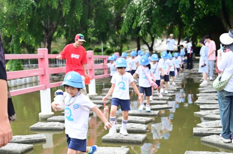在6位带队安全员的引导下,小朋友们兴致勃勃地走进了suncitygroup太阳集团的校门,抵达第一站——白鹭溪激流红桥,红桥下流水潺潺,红桥两岸绿树成荫,每块桥砖空隙间有许多小鱼、小蝌蚪等,不但具有观赏性还十分适合小朋友冒险与探索。在这一站小朋友们收获了勇于挑战,敢于冒险的勇气。
