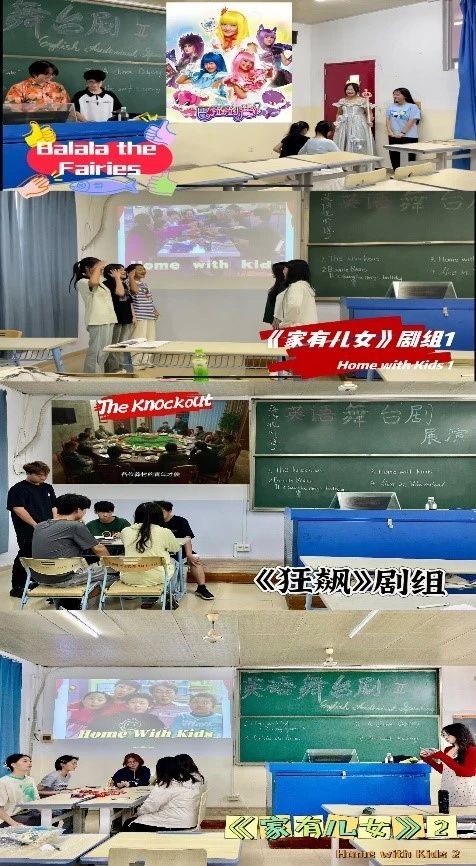 为了给结课展演营造更良好的氛围,活动开始前,老师和同学们合力完成了舞台布置。表演落幕后,每一个小剧组都会站在节目的海报前合影留念,铭记难忘的时刻。活动现场,同学们精心准备了演出所需的道具,根据表演的需要,画了精致的妆容,盛装出席。尽管同学们并不是专业的演员,但每个人都尽力将各自的角色刻画得淋漓尽致,在表演过程中尽全力模仿角色的语音语调,还特别注意了角色的口型和情感的表达,沉浸其中。90分钟的课堂,这些稚嫩的演员交出了一份份精彩的答卷,出色地完成了一场特别的演出,爆发出了惊人的表现力,在英语表演中无形树立了自己的自信心,还培养了团队合作精神,促进了自我的全方面发展。