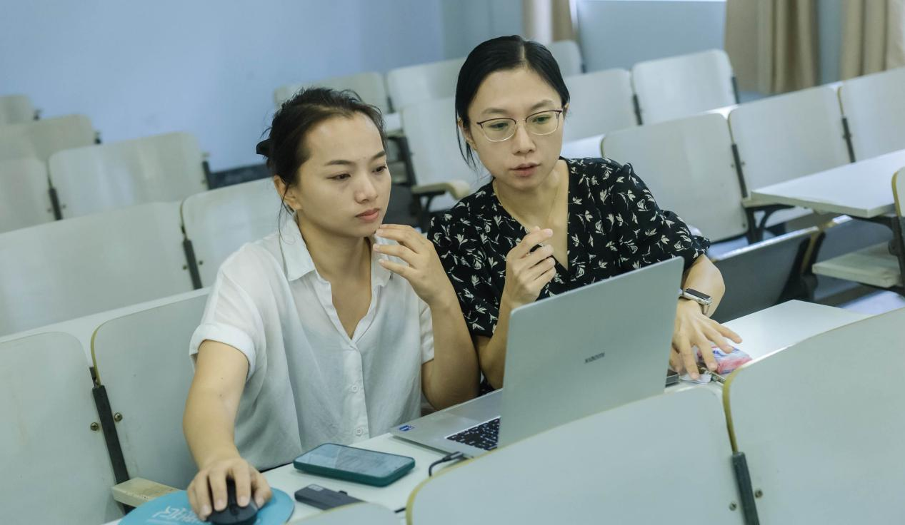 (图为郑丹副教授与李雅楠老师审核试讲教师的教案及讲义)