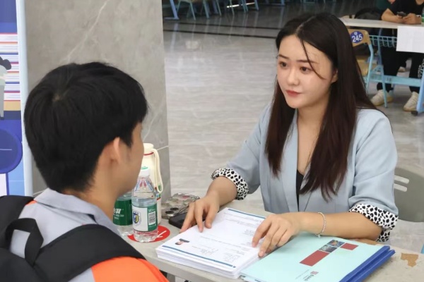 招聘会现场气氛热烈,企业在展位上向求职者们详细介绍企业文化、岗位需求、薪酬福利等信息,来求职的毕业生们也手握简历,与其进行沟通交流,诉说自身优点与需求。